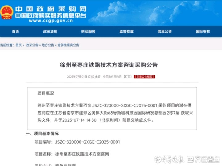 7月3日,记者在中国政府采购网发现,《徐州至枣庄铁路技术方案咨询采购公告》已在该网站公示。这意味着此前规划的徐枣铁路已开始前期工作,将与正在建设的济枣高铁衔接,在济南与徐州之间形成新的高铁线路。详情>>