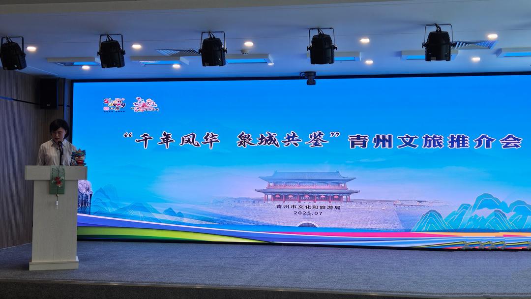 7月3日,“千年风华 泉城共鉴”青州文旅推介会在济南举行。活动现场,青州文旅推介官和青州重点旅游镇街负责人通过视频、图片、ppt的形式,全面展示了青州的古城体验、书画文化、花卉观赏、生态休闲、非遗民俗等丰富的特色文旅资源和产品。现场还设置了青州特色旅游商品展示区,全方位宣传推介青州好品,并赠送“青州有礼”特色旅游商品。