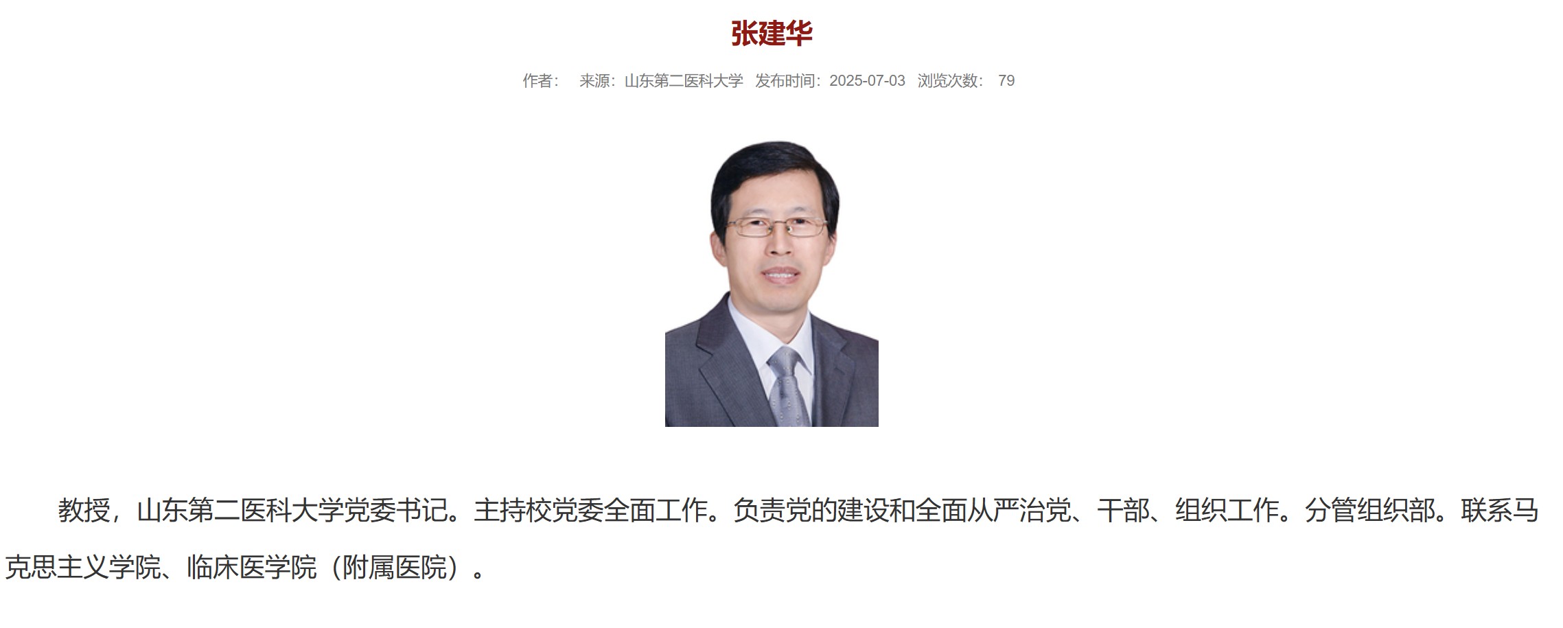 近日,山东第二医科大学网站更新学校领导信息,张建华已任山东第二医科大学党委书记。