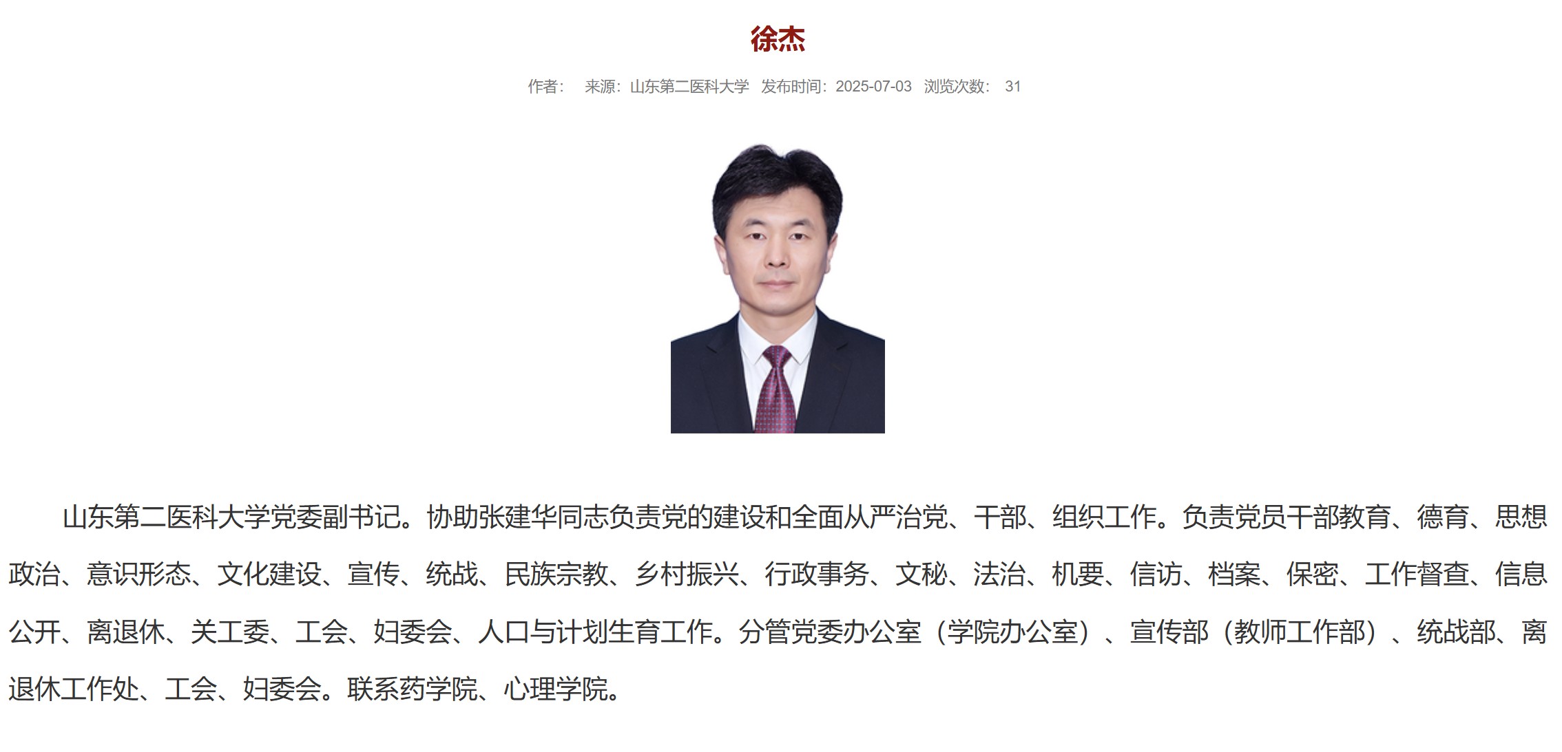 此外,此前担任威海市委常委、宣传部长的徐杰,已任山东第二医科大学党委副书记。