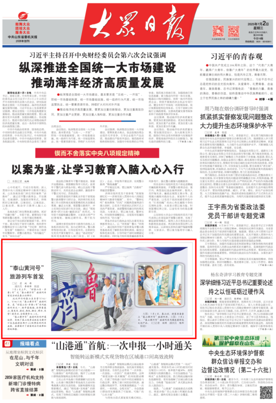 大众日报·泰安一周:“泰山黄河号”旅游列车首发上头版,泰安港上半年吞吐量集疏运量创新高