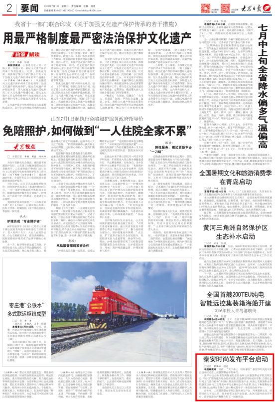 7月1日,2版要闻刊发《泰安时尚发布平台启动》,报道日前,“天下泰山 时尚泰安”泰安市时尚发布平台启动仪式在山东服装职业学院举行。详情请点击这里——《泰安时尚发布平台启动》