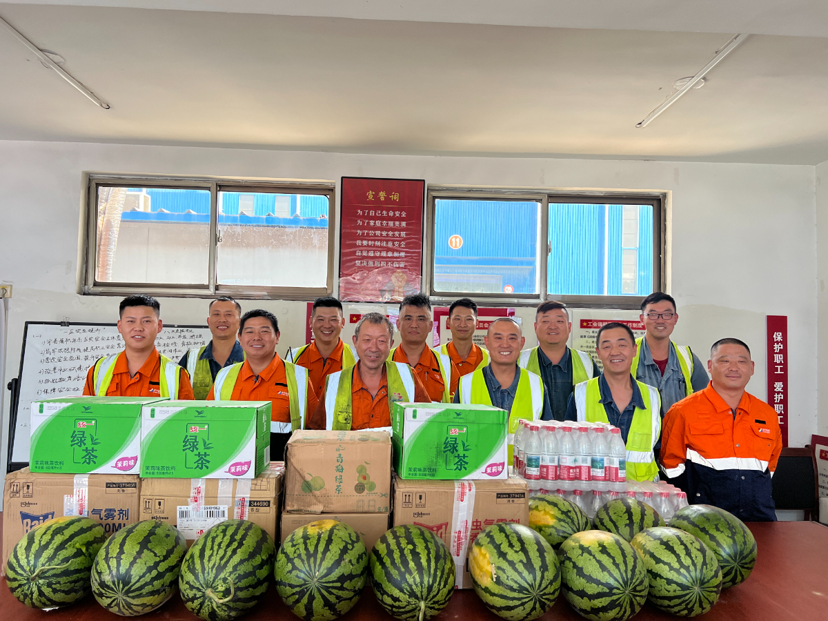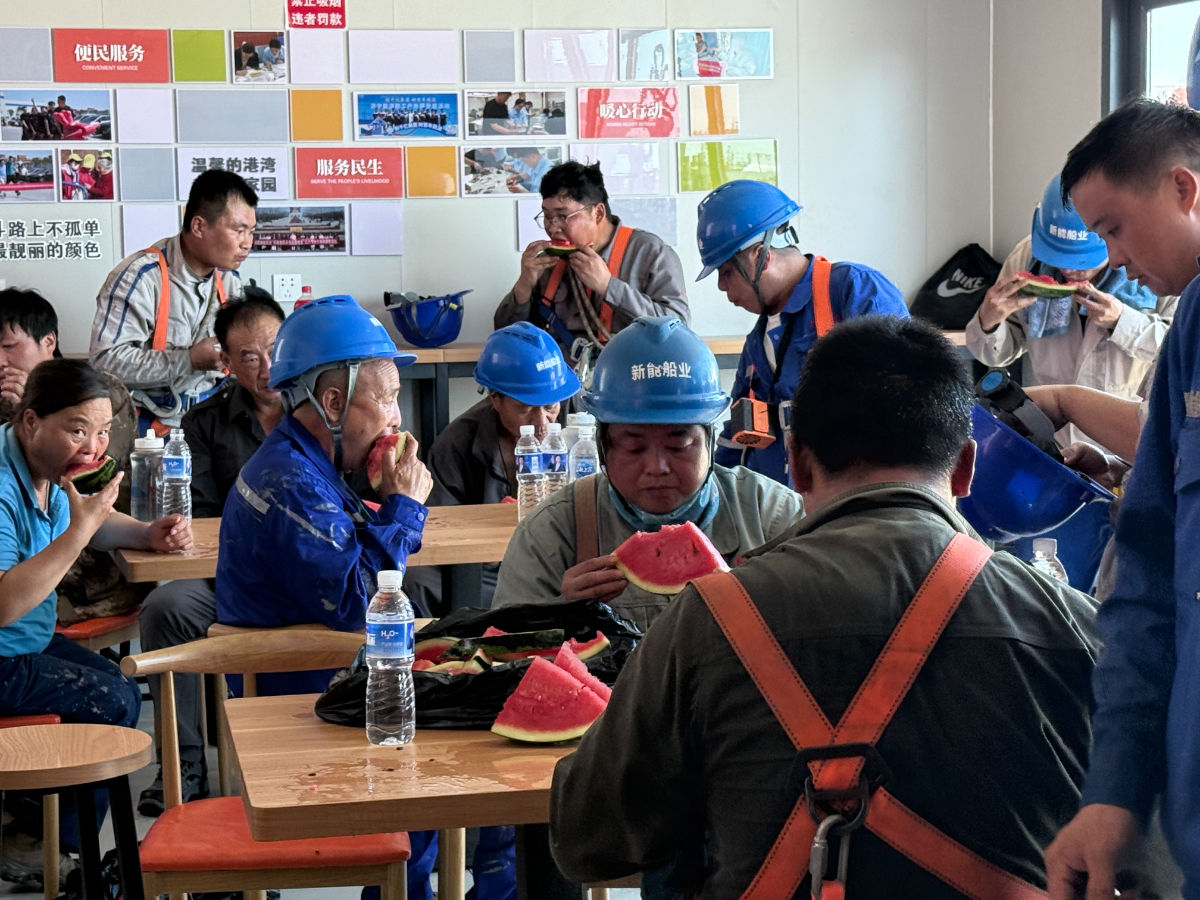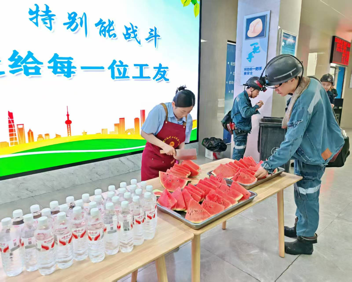 新能船业工会志愿服务队,以职工驿站为依托,在船台及码头分批为在户外劳动的职工送去西瓜及冰水和绿豆汤等饮品,近日高温天气期间,送清凉活动将持续开展。