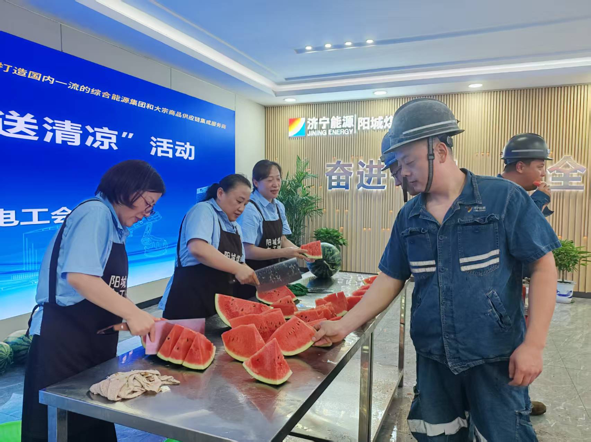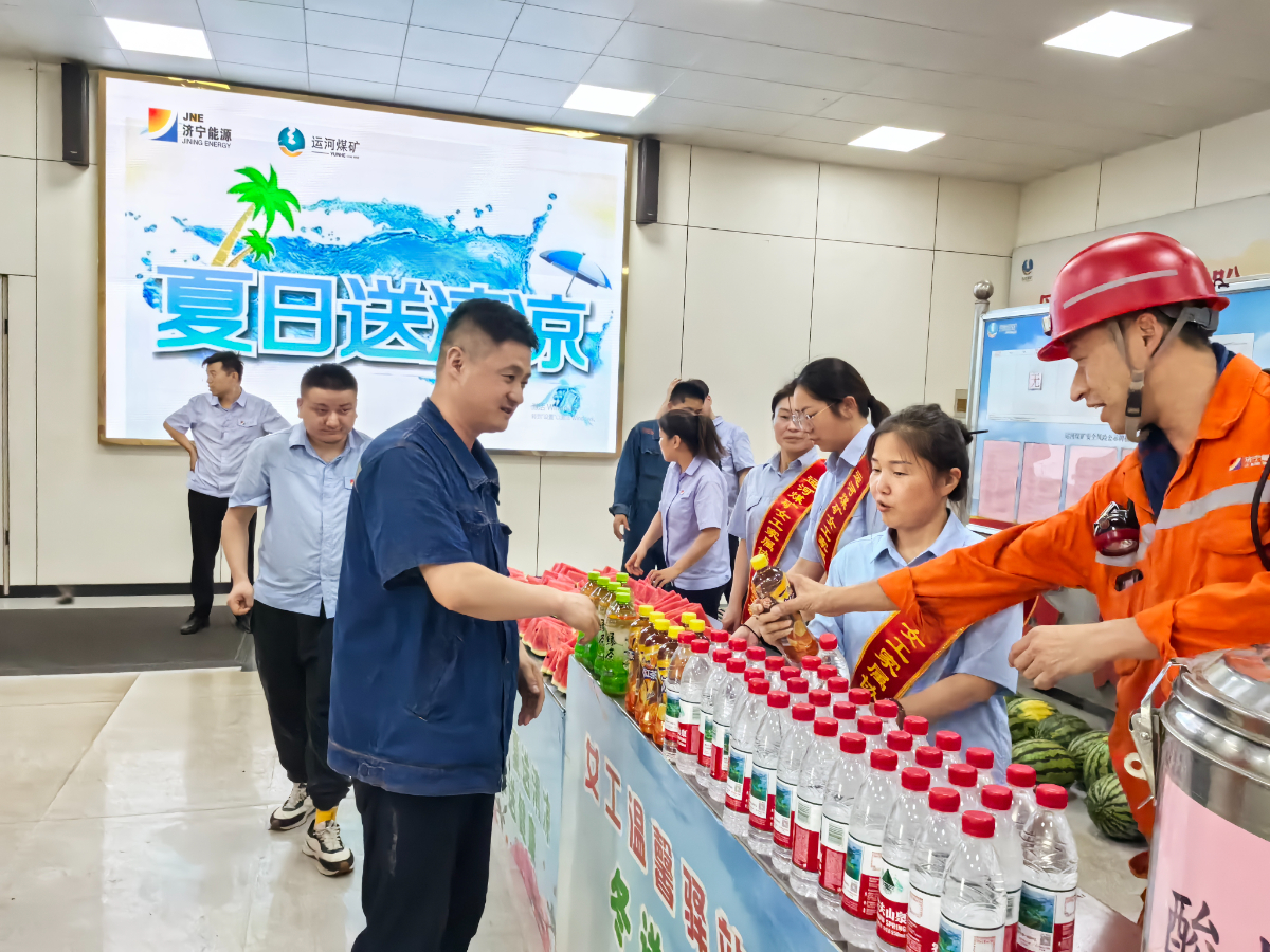 7月2日-5日,在济宁能源集团工会“夏送清凉”的倡议下,各权属企业基层工会迅速响应行动。一批爱心冰柜、清凉物资已陆续送到港口一线、煤矿井口和企业车间,为坚守在岗位上的劳动者及时送去清凉。截至5日,各权属企业工会开展“夏送清凉”活动100余次,各种夏送清凉的关爱举措,为更多一线劳动者提供“一站式”清凉服务。图为阳城二号井在井口开展“夏送清凉”活动。