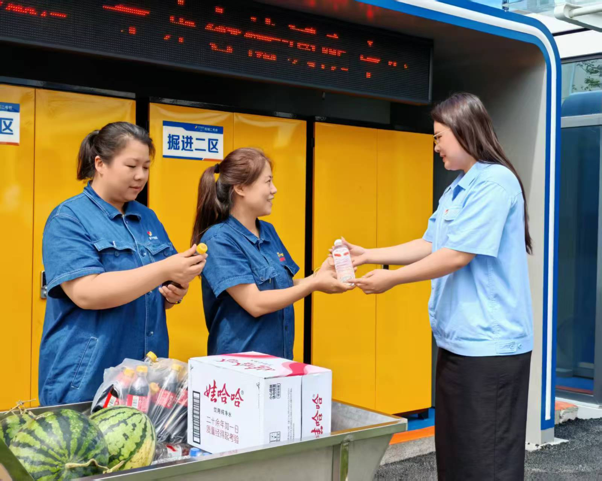金源煤矿“移动清凉驿站”坚持每天将西瓜、饮料、水等清凉物资配送到各个工作场所,确保作业现场员工能及时补充水分、预防中暑,为高温下坚守岗位的矿工提供坚实的后勤保障。