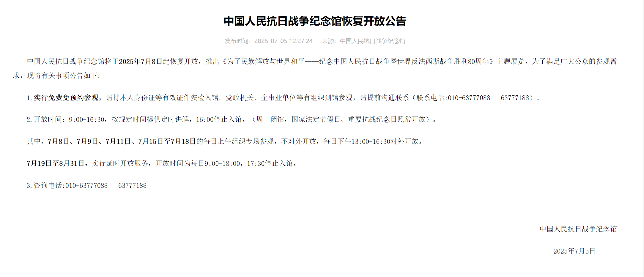 中国人民抗日战争纪念馆5日发布公告称,中国人民抗日战争纪念馆将于2025年7月8日起恢复开放。