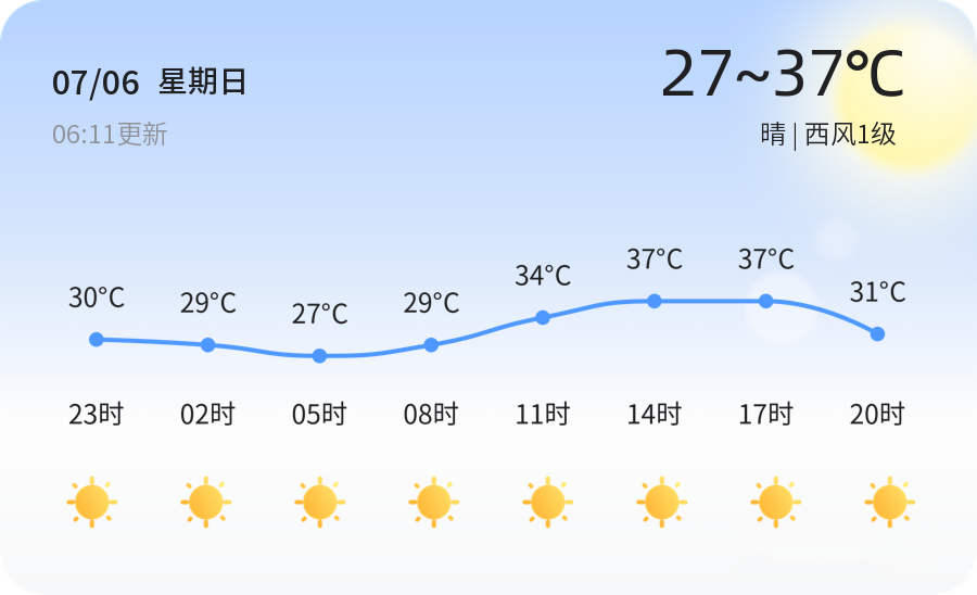 今天是7月6日,农历六月十二,星期日。菏泽市迎来晴好天气,白天气温最高可达37摄氏度,最低气温为27摄氏度。目前温度为27.9摄氏度,西风1级,空气湿度80%。空气质量状况为良,PM2.5指数为51,适宜户外活动。市民出行时请注意防晒,随身携带遮阳工具,及时补充水分,以防中暑。建议上午10点至下午4点避免长时间户外活动。