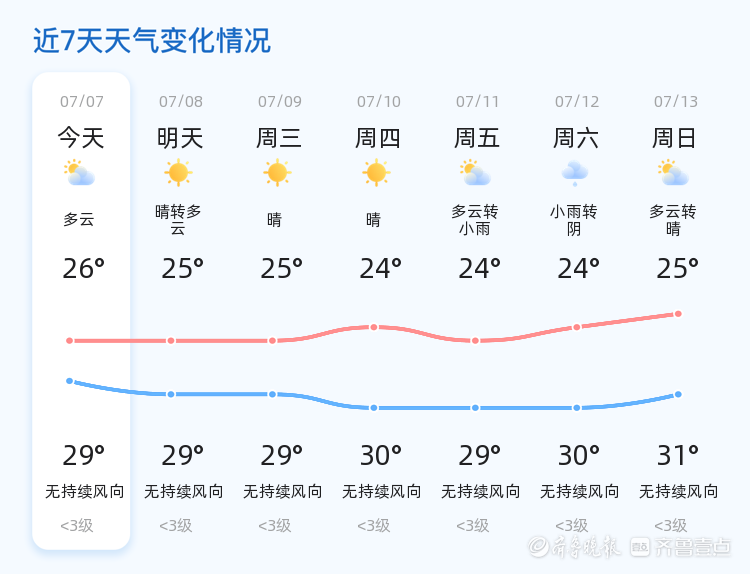 未来三天,日照市天气以晴到多云为主,气温在24℃至30℃之间波动。其中,7月11日有小雨天气,提醒市民出行时携带雨具,注意防范道路湿滑。总体来看,天气较为平稳,适宜市民日常生活和户外活动。