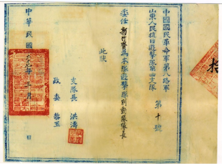 经考证,此《委任状》为“中国国民革命军第八路军山东人民抗日游击队第四支队第十号”。内容是:“委任郭竹斋为本队游击队别动队队长”。署名:支队长洪涛,政委黎玉。时间是:中华民国二十七年(1938年)三月。并且在任命书上盖有红色的印章,印文为“国民革命军陆军第八路军山东人民抗日游击队第四支队关防”,共26字。