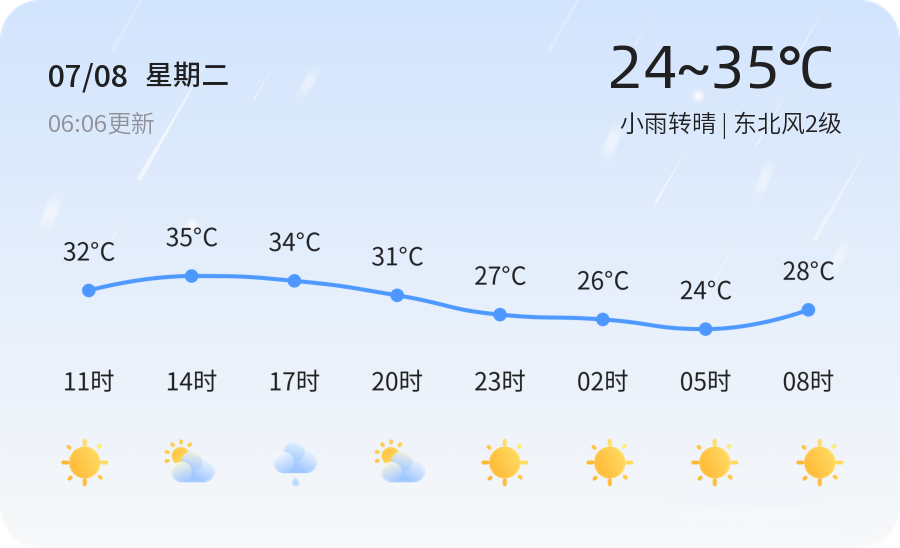 今日是2025年7月8日,农历六月十四,星期二。泰安市今日天气为小雨转晴,东北风2级,空气湿度78%,PM2.5指数为36,空气质量优。今日最高气温35℃,最低气温24℃。早晨气温较低,体感凉爽,白天气温逐渐上升,紫外线较强,市民出行请注意防晒,随身携带雨具以防突降雨。 未来三天,泰安市将持续高温天气。预计明日最高气温将达到36℃,最低气温24℃,天气晴朗。后两日气温略有波动,但最高气温仍维持在36℃左右。由于高温天气持续,市民需注意防晒补水,谨防中暑。同时,需关注天气预报,防范可能出现的分散性雷阵雨天气。 温馨提示