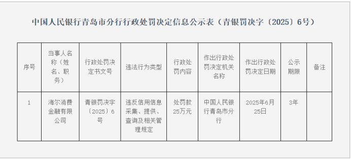 7月4日,中国人民银行青岛市分行官网公示的行政处罚决定书(青银罚决字〔2025〕6号)显示,海尔消费金融有限公司因为违反信用信息采集、提供、查询及相关管理规定,被罚款25万元。上述行政处罚决定书显示,作出处罚的时间是6月25日,公示期限为3年。