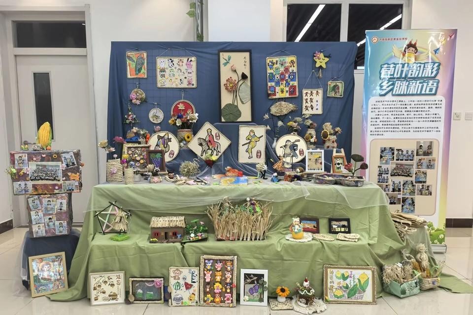值得一提的是,校园展览区成为了这场 “魔法秀” 的展示舞台,各式各样的作品令人目不暇接。用苞叶精心制作的 “荷花韵” 立体画,其叶脉纹理清晰逼真,花朵色泽娇艳欲滴,宛如真花绽放;麦秆编织而成的二十四节气挂饰,巧妙地将传统农耕智慧融入其中;还有结合黏土、干花等多种材料的综合创作,打破常规,为乡土材料赋予全新生命力,玩出了别具一格的新花样。