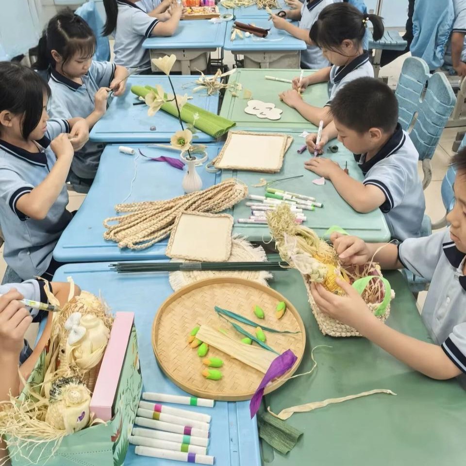 从课堂创作到成果展示,孩子们收获颇丰。在与苞叶亲密接触的过程中,他们的动手能力得到充分锻炼,学会从平凡材料中发现独特之美;在团队协作创作时,孩子们懂得了分享与互助的重要性;通过触摸这些乡土材料,他们与传统文化、田园生活的距离被大大拉近。