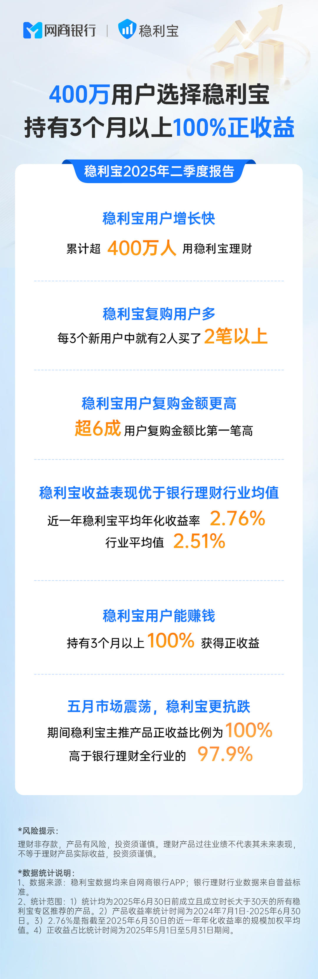 7月8日,网商银行旗下银行理财专卖平台“稳利宝”发布2025年二季度报告。报告显示,在低利率背景下,稳利宝仍然凭借稳健的收益和普惠的特性赢得更多用户信任。