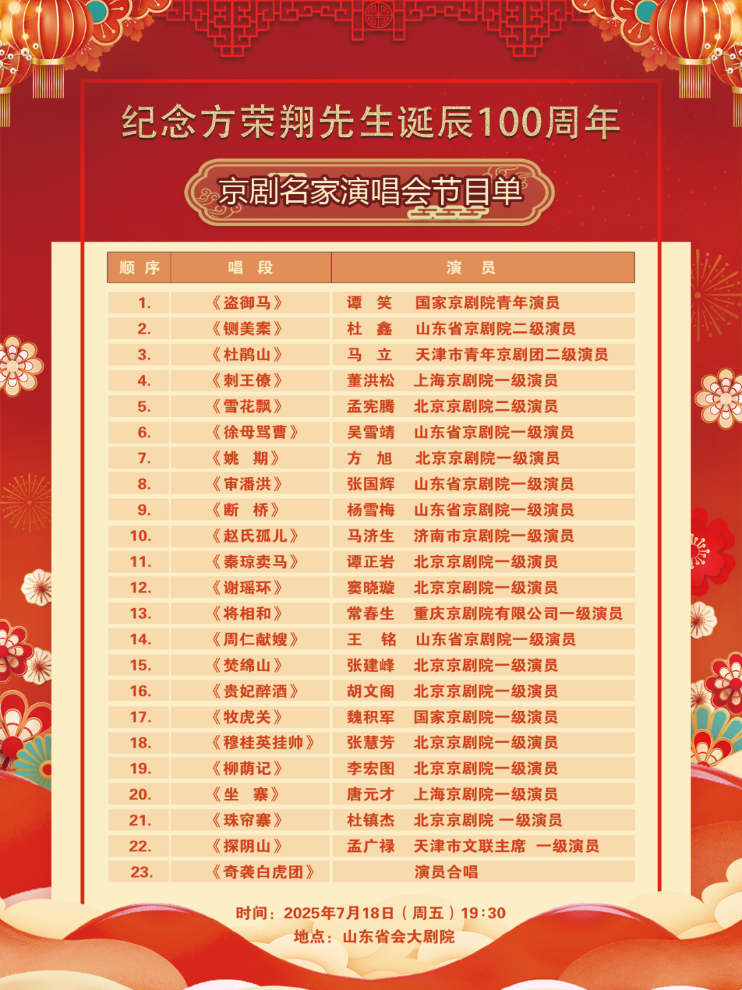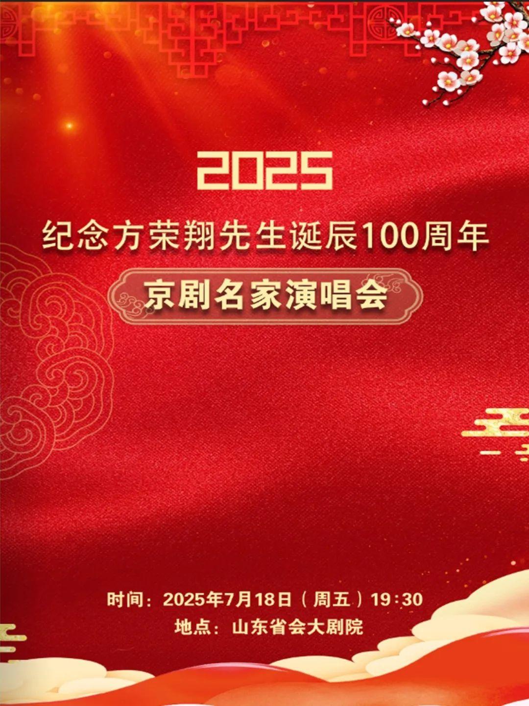 2025年是著名京剧表演艺术家、裘派艺术优秀传人方荣翔先生诞辰100周年。7月18日19:30,纪念方荣翔先生诞辰100周年京剧名家演唱会将在保利山东省会大剧院上演。