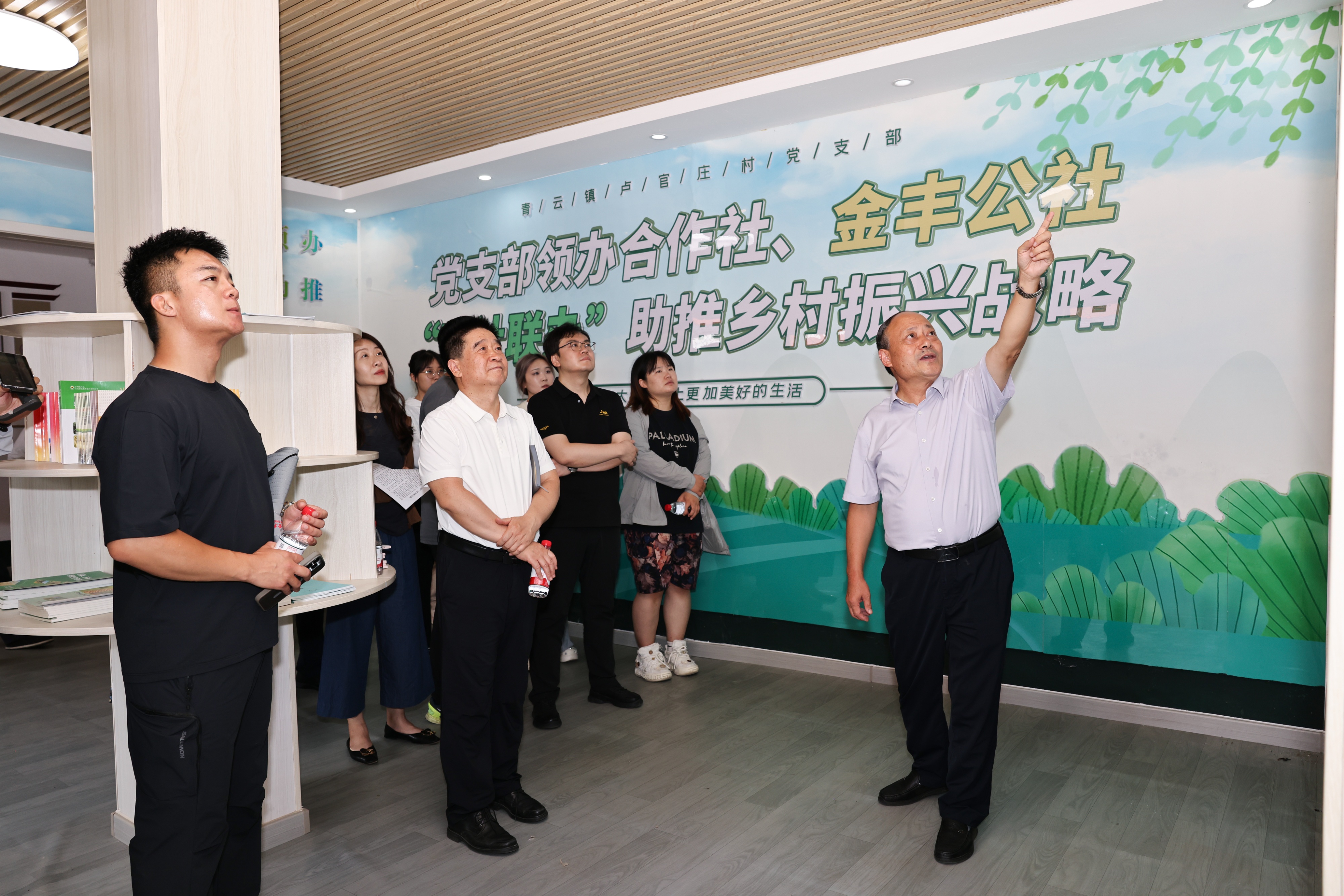 调研团在金丰公社总部及临沭县青云镇卢官庄村托管农田现场,深入了解了其创新模式——“党建引领 双社联合 壮大村集体经济”(以下简称“双社联合”模式)。该模式以村党支部领办合作社为纽带,整合农户自愿入股的土地,将“小田”变“大田”,与金丰公社深度合作,构建“村社农”三位一体架构,实现规模化、专业化生产。