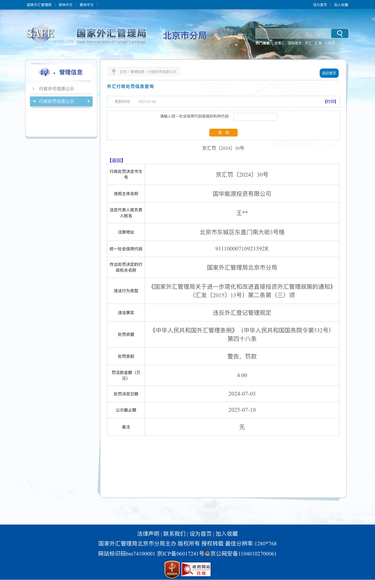国家外汇管理局北京市分局依据《中华人民共和国外汇管理条例》(国务院令第532号)第四十八条的规定,对该公司作出警告并处以罚款人民币4万元整的行政处罚决定。处罚决定于2024年7月3日正式作出。该处罚信息公示期至2025年7月10日。