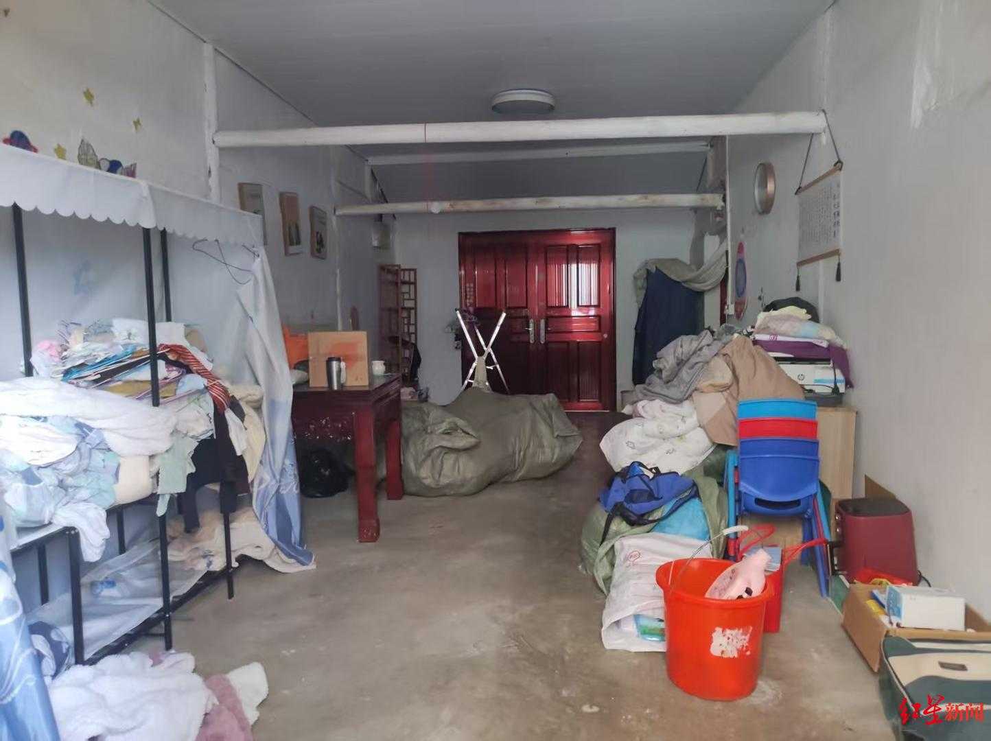 隔着窗户望进去,五六十平米的房屋分成两间,四张床铺上堆着杂物,水泥地板上堆放着被褥和衣物。