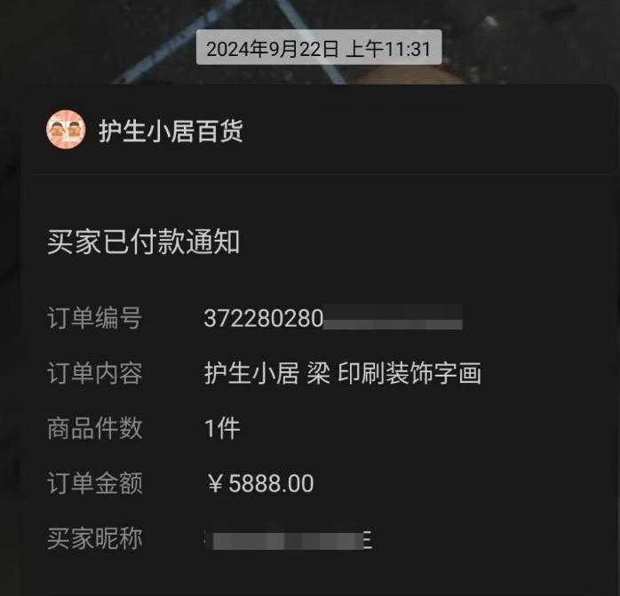 “护生小居”内部工作人员告诉红星新闻记者,道禄自2016年就开始在网上卖货,主要是素食月饼和茶叶,2022年在短视频平台开设网店。根据其内部工作人员提供的微信小店销售记录,红星新闻记者统计了2024年9月22日一天内的卖货总额,约为72000元。货品多为“装饰画”,最高一件价格5888元,最低为128元,据其内部工作人员透露,这些货品多用红绳代替,并没有实物,成本“可以忽略不计”。