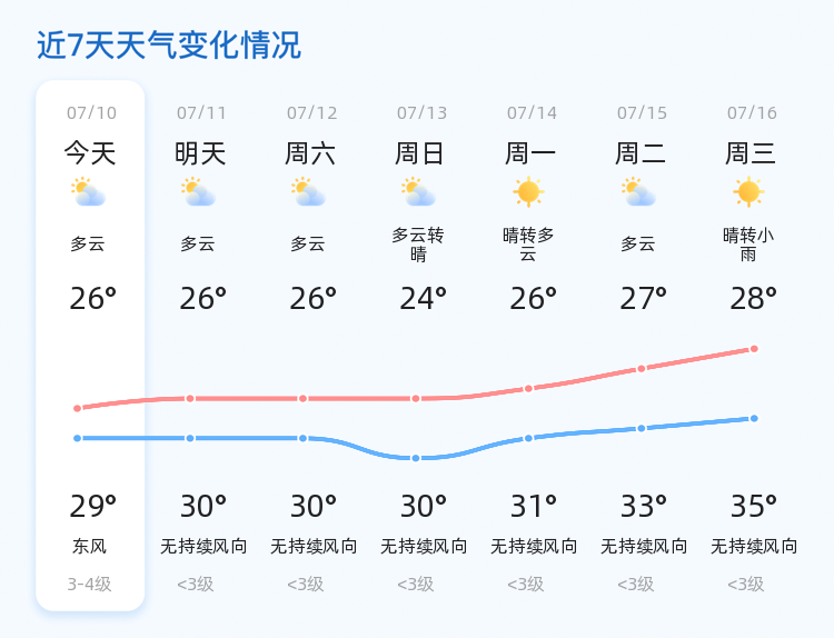 今日是7月10日,星期四,农历六月十六,日照市天气多云,东风2级,当前温度25.8℃,相对湿度92%,空气质量良好,PM2.5指数33。今日最高气温29℃,最低气温26℃,各区天气情况基本一致,多云为主,风力较小,适合市民出行和户外活动。 明日天气与今日相比略有变化,预计仍为多云天气,但风力减弱至无持续风向,气温将在26℃至30℃之间波动。相比今日,明日的气温稍有上升,市民需注意防晒和适时增减衣物。 未来三天,日照市天气趋势总体平稳,以多云为主,偶有转晴或小雨天气。气温将逐步上升,最高气温可达30℃至35℃,最低气温维持在26℃至28℃。特别提醒市民,高温时段应避免长时间户外活动,注意补水防晒。 温馨提示