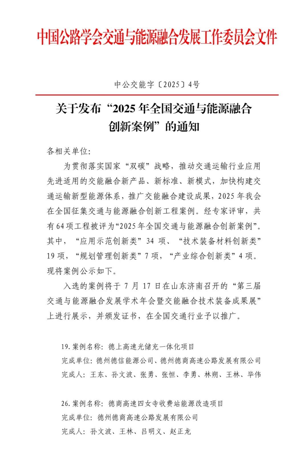 近日,中国公路学会交通与能源融合发展工作委员会公布了“2025年全国交通与能源融合创新案例”评选结果,德达集团“德上高速光储充一体化项目”“德商高速四女寺收费站能源改造项目”成功入选,成为全国64项创新案例中的优秀代表。