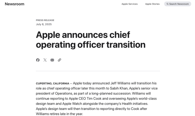 即将在本月底接任首席运营官一职的苹果运营高级副总裁萨比赫·汗也年近六旬。汗在苹果效力30年,自2019年起以运营副总裁的身份进入苹果高管团队,负责苹果的供应链、采购和物流事务。他未来也将聚焦于运营事务,原先由威廉姆斯主管的苹果设计团队、手表团队和健康团队将直接向库克汇报工作。