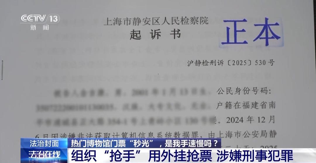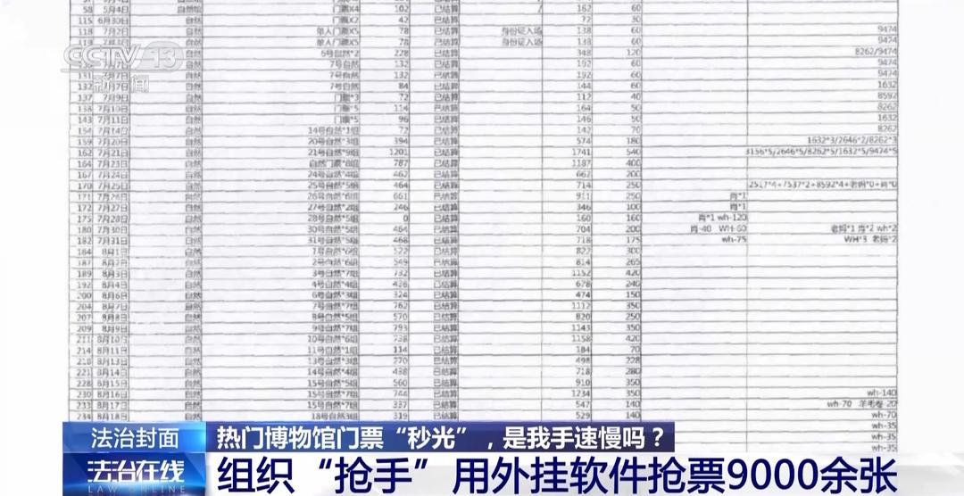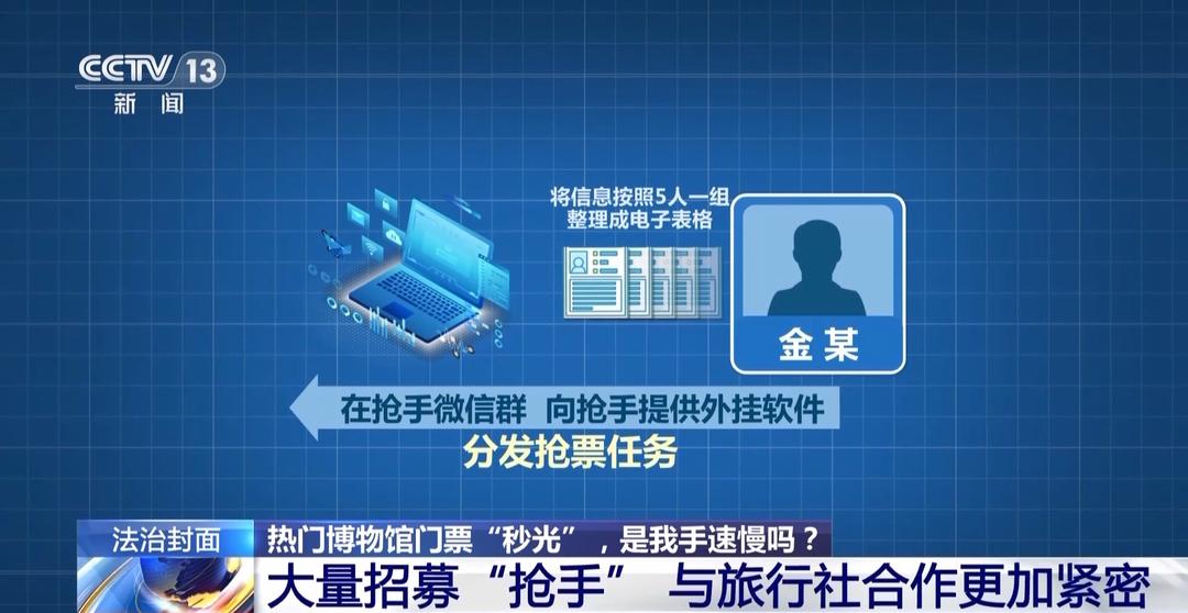 经查,2023年8月至2024年10月期间,犯罪嫌疑人金某、兰某等人组织数百名“抢手”,使用外挂软件,累计抢购上海某博物馆等文化场馆门票9000余张。