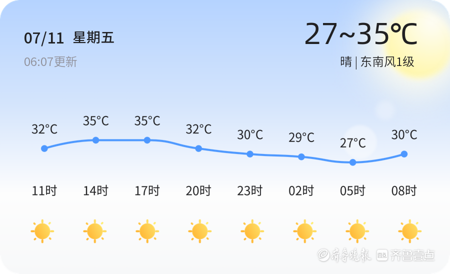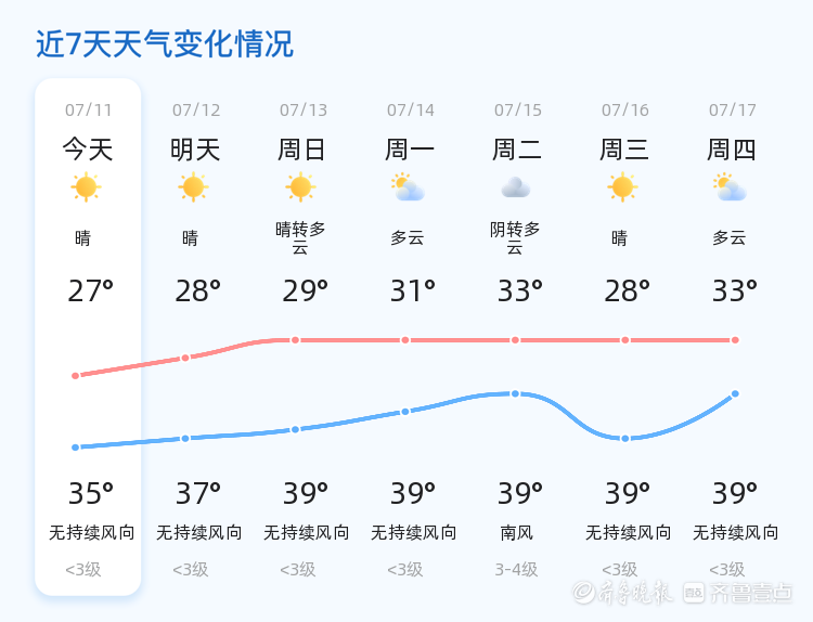 今天是7月11日,星期五,农历六月十七。聊城市的天气以晴朗为主,气温较为舒适,全天温度在27℃至35℃之间。目前时间为上午6时07分,实时气温27.5℃,东南风1级,空气湿度82%,PM2.5指数为48,空气质量良好。今天全市各区均以晴朗天气为主,适合市民出行和户外活动。 明天7月12日,聊城市的天气将继续保持晴朗,但气温将略有上升,全天温度预计在28℃至37℃之间。与今天相比,明天的最高气温将增加2℃,市民需注意防晒和补水。 未来三天,聊城市的天气将以晴转多云为主,温度逐步升高,预计最高气温将达到39℃。提醒市民注意防暑降温,尤其是午后高温时段,尽量减少户外活动。此外,未来三天风力较小,空气湿度较高,市民需做好防晒和补水工作。 温馨提示