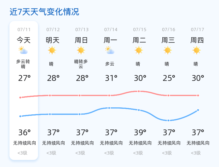 明天(7月12日)德州天气将转为晴天,气温与今日相比略有上升,预计最高气温可达37℃,最低气温28℃。风力继续保持微风状态,无明显风向。