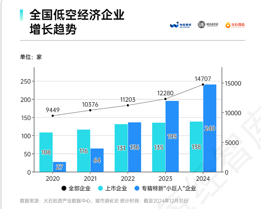 《报告》显示,2020— 2024年,全国低空经济上市企业、专精特新“小巨人”企业数量分别从108家、27家 上升至138家、240家,分别增长27.8%、7.9倍。