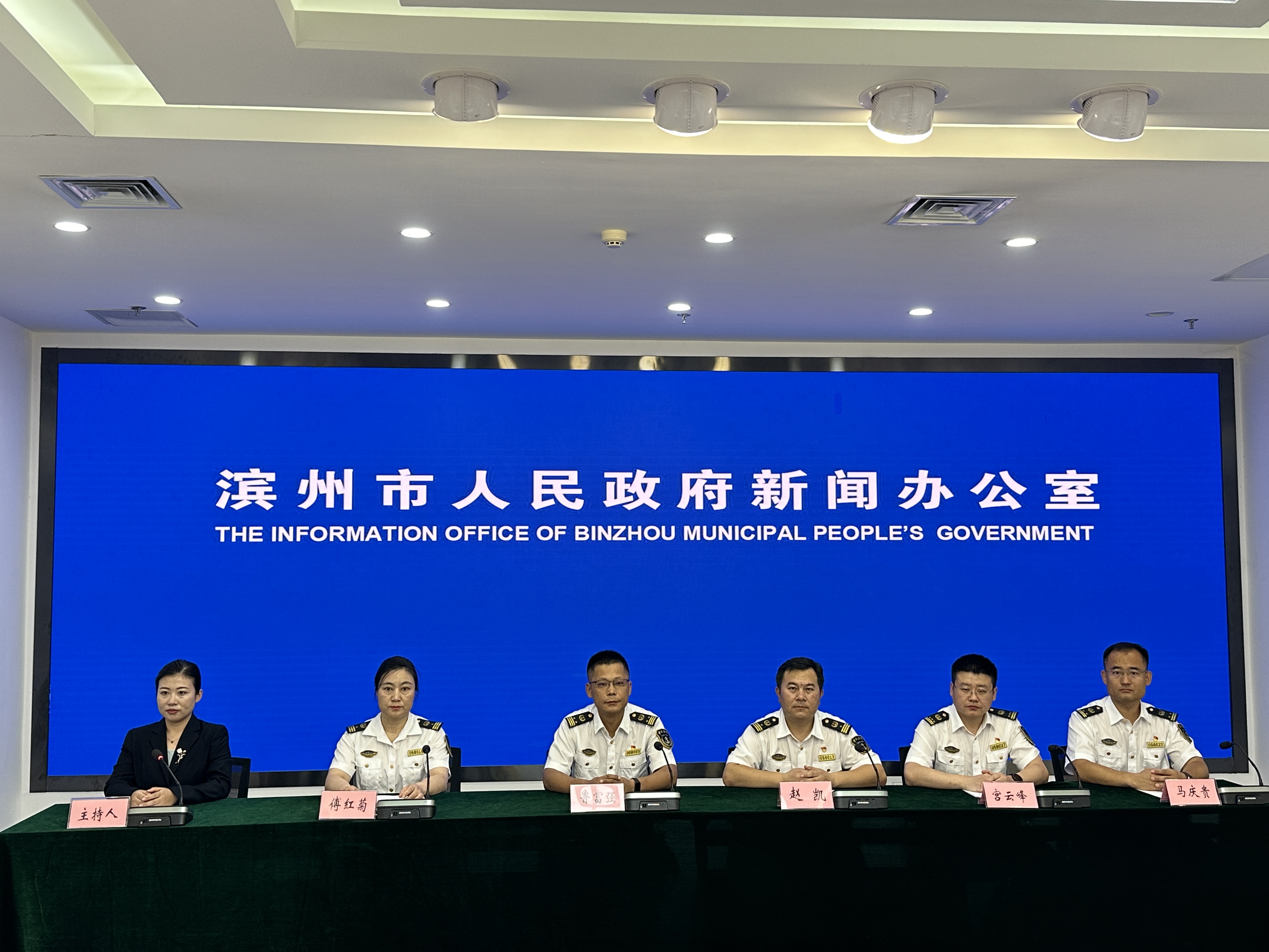 7月11日,滨州市政府新闻办召开海事服务保障滨州市经济社会高质量发展新闻发布会,滨州海事局党委委员、副局长、新闻发言人鲁富强,滨州海事局综合业务处处长赵凯,滨州海事局政务中心主任傅红菊,无棣海事处处长宫云峰,沾化海事处处长马庆贵,共同介绍了滨州海事局在服务保障经济社会高质量发展方面的各项举措,并回答记者提问。