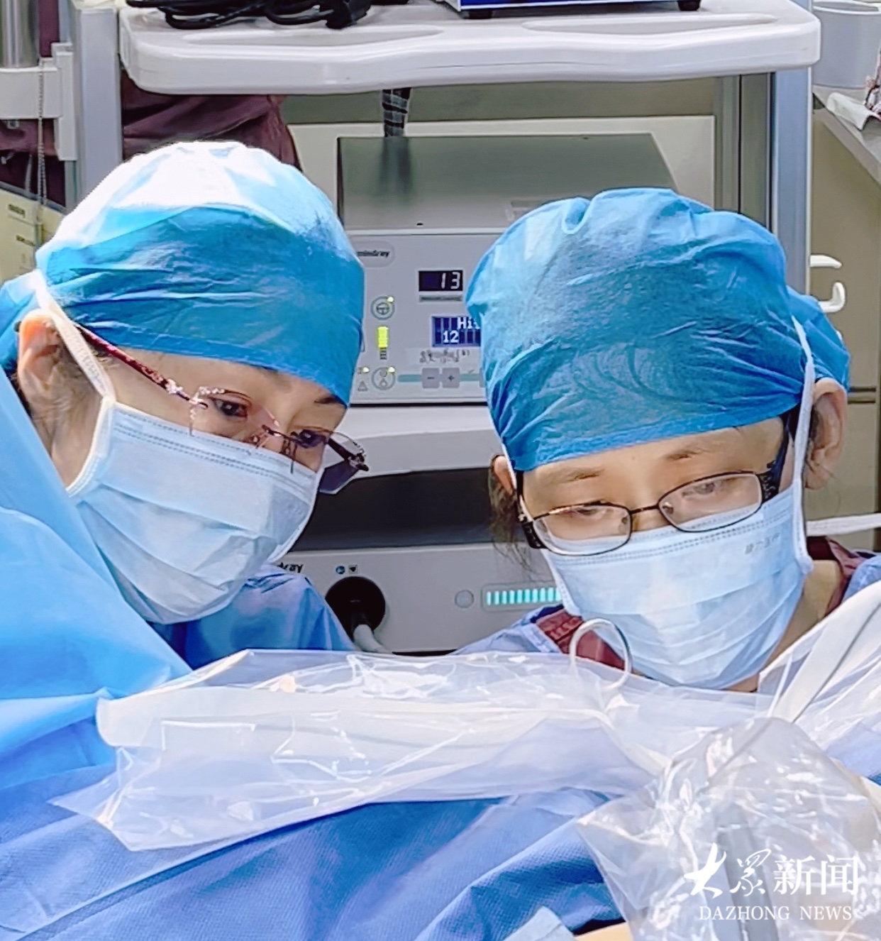 北京妇产医院妇瘤科耿宇宁博士(右)与莲池妇科团队手术中