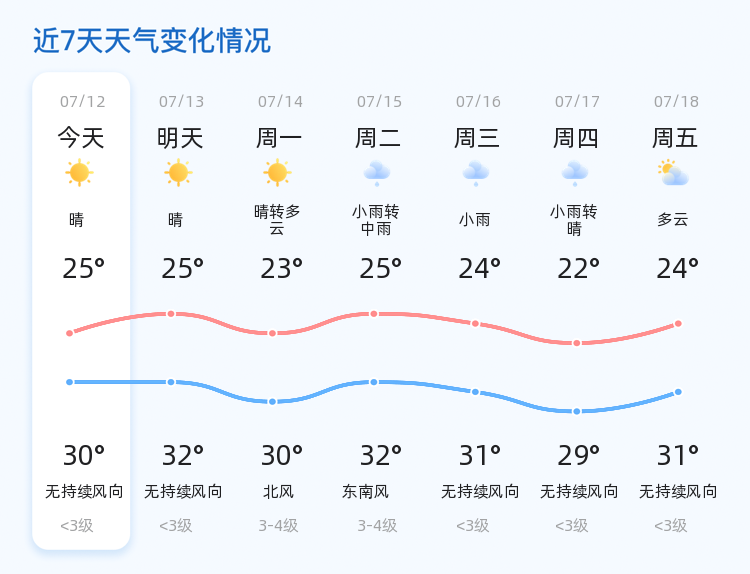 今日是7月12日,星期六,农历六月十八。烟台市迎来晴好天气,全市各区均以晴朗天气为主,白天气温在25℃至30℃之间,南风2级,空气湿度为82%,PM2.5指数为25,空气质量良好。市民们可以趁着晴朗的天气外出活动,享受夏日的阳光。