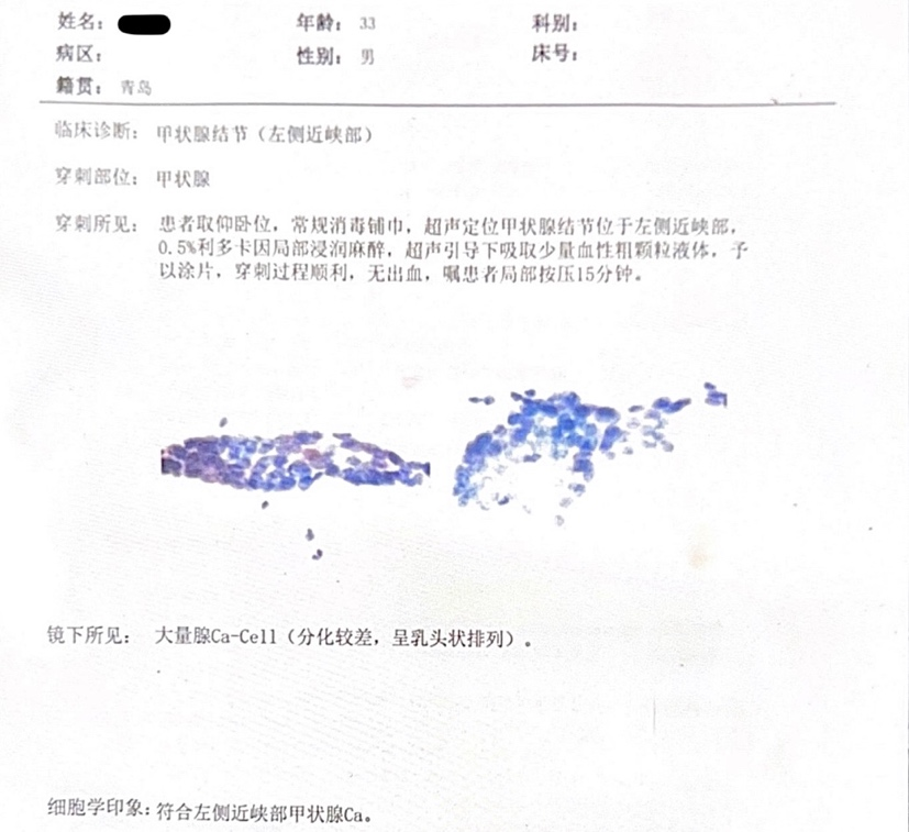 为保障患者手术顺利开展,科室请血液科协助制定了围手术期VIII因子的替代治疗方案,经全科病例讨论制定了周密的手术方案。患者经积极治疗后凝血功能、凝血因子活度符合手术要求,首先为患者进行了甲状腺细针穿刺活检,病理确定为甲状腺乳头状癌,临床分期为cT1aN0M0 I期。