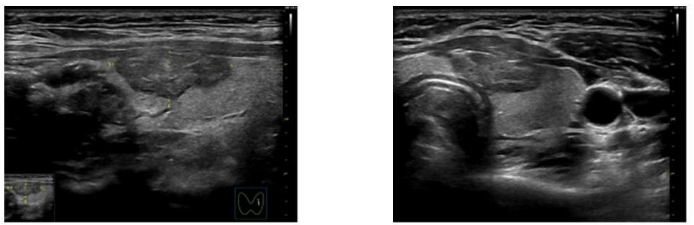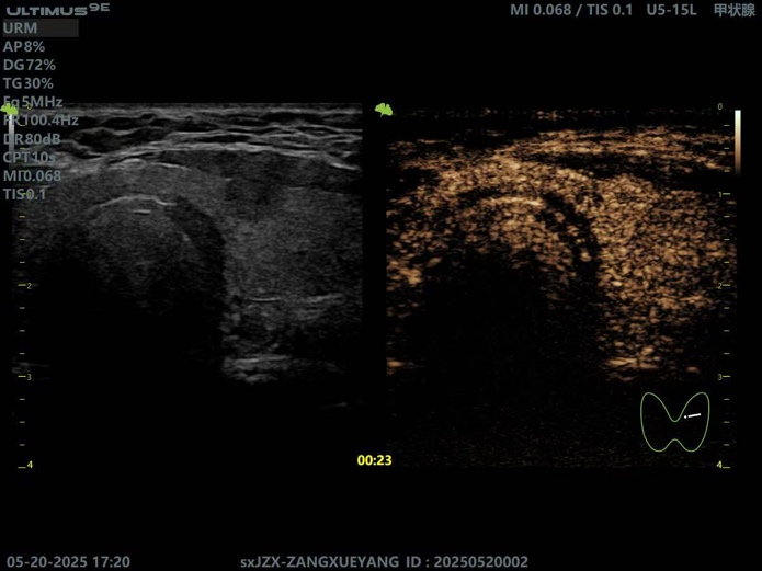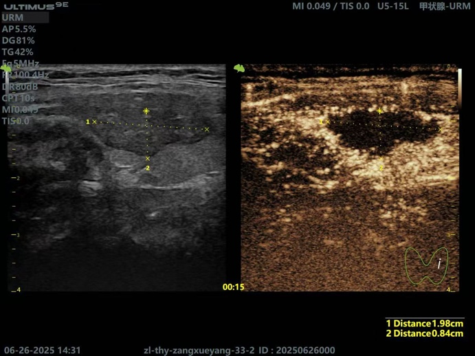 随后,在叶欣的指导下,副主任医师陈守华及主任医师王爱光为患者实施了甲状腺癌微波消融术,手术仅耗时15分钟,术中及术后无出血,通过精心的治疗与护理,患者术后3天康复出院。术后1月复查甲状腺超声造影提示病灶完全消融,且甲功五项指标正常,患者及家属对于治疗效果非常满意。