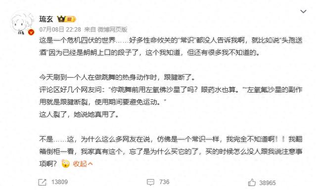 引发此次热议的是一位博主发布的微博。她在文中提到,自己看到有人在跳舞热身时跟腱断裂,评论区有很多网友询问其是否在跳舞前使用过左氧氟沙星。这让她感到非常惊讶,因为她自己家里就有这种药,却从来不知道有这样的风险。这则微博迅速引发了大量网友的共鸣和讨论,许多人表示自己也是第一次听说。