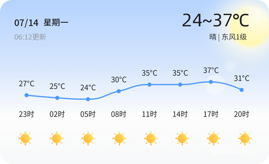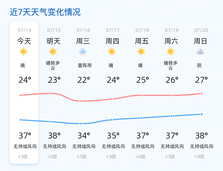 今天是7月14日,农历六月二十,星期一。德州迎来晴朗天气,气温较高,最高气温达到37℃,最低气温为24℃。目前气温为25.8℃,天气晴朗,东风1级,空气湿度为78%,PM2.5指数为27,空气质量良好。今天全市各区天气晴朗,气温普遍较高,市民需注意防晒和补水。明天天气晴转多云,气温略有上升,最高气温38℃,最低气温23℃。市民需注意天气变化,及时增减衣物。未来三天,德州将出现雷阵雨天气,气温略有下降。雷阵雨可能带来局地短时强降雨和大风,市民需注意防范。此外,未来三天最高气温为38℃,最低气温为22℃。市民需注意防暑降温,避免高温时段外出。市气象部门提醒市民,关注天气变化,合理安排出行,确保安全。
