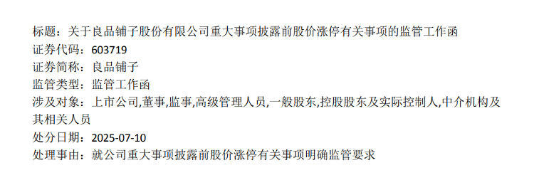 监管部门的反应堪称“光速”!当晚,上海证券交易所火速向良品铺子发出监管工作函,就公司重大事项披露前股价涨停一事明确监管要求,对象涵盖上市公司、董监高、股东、控股股东及实控人、中介机构等。