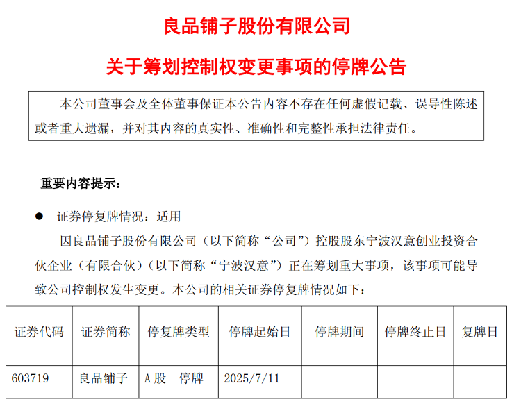7月10日晚间,良品铺子(603719)发布公告称,公司控股股东宁波汉意创业投资合伙企业(有限合伙)正在筹划重大事项,该事项可能导致公司控制权发生变更。