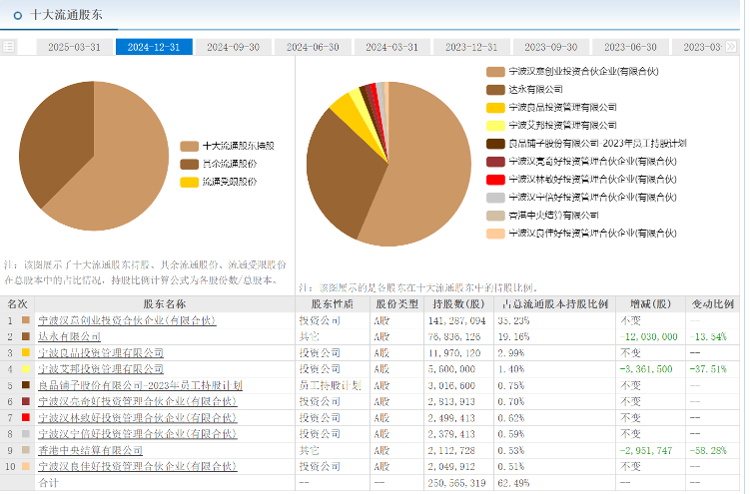 公司控股股东宁波汉意、宁波汉亮等股东近两年亦买卖动作不断。根据良品铺子年报,宁波汉意成立于2017年8月,合伙人包括普通合伙人宁波汉旭艺园投资管理有限责任公司、有限合伙人杨红春、有限合伙人杨银芬、有限合伙人张国强、有限合伙人潘继红,最终控制方为杨红春、杨银芬、张国强、潘继红。天眼查数据显示,宁波汉亮及其一致行动人宁波汉宁、宁波汉良、宁波汉林等公司同样由良品铺子创始人之一的杨红春控股。