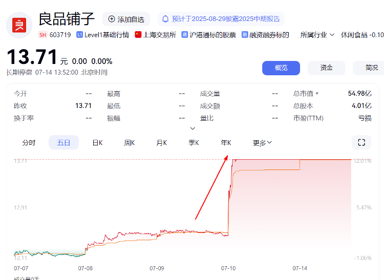 就在公告发布前的7月10日,良品铺子股价开盘后不久便直线拉升,迅速封死涨停板,最终以涨停价13.71元/股收盘。当天成交量显著放大,换手率高达7.26%。蹊跷的是,交易时段内市场上并未出现任何与公司相关的重大利好消息。这波“未卜先知”式的涨停,瞬间点燃了市场对内幕信息泄露和违规交易的质疑。