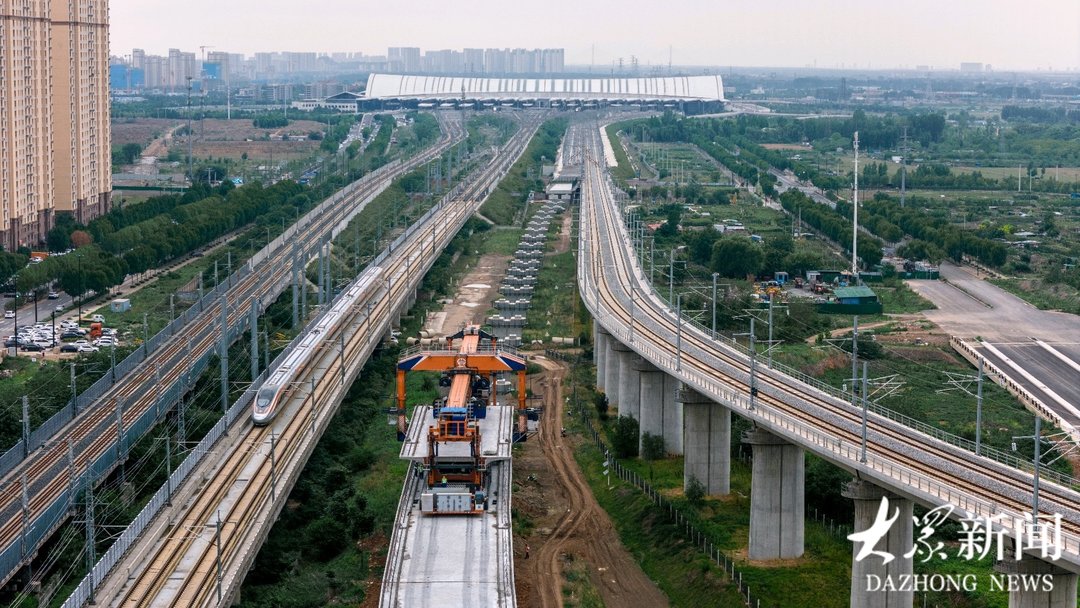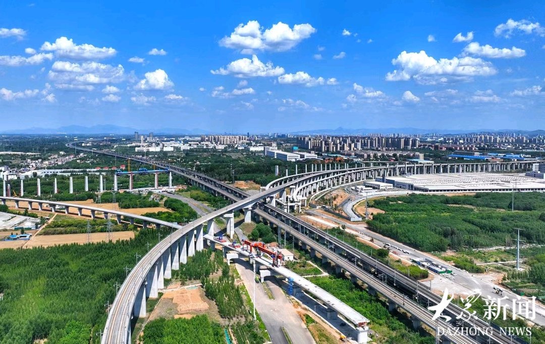 为确保邻营线箱梁架设顺利有序推进,鲁南高铁公司与中铁四局提前策划,积极对接国铁济南局等管理单位,组织专题方案研讨会,提前研判施工风险,统筹做好计划报批、技术方案审查、施工要点把控等工作,通过“精准选型-专业团队-智慧管控-硬核盯防”四维协同,成功攻克小半径、大坡度、上跨下穿既有线、馈电风险等复杂难题。仅需10名作业人员,在4个小时的作业时段内,就能完成一孔箱梁过孔、喂梁、落梁、灌浆的全流程架设。