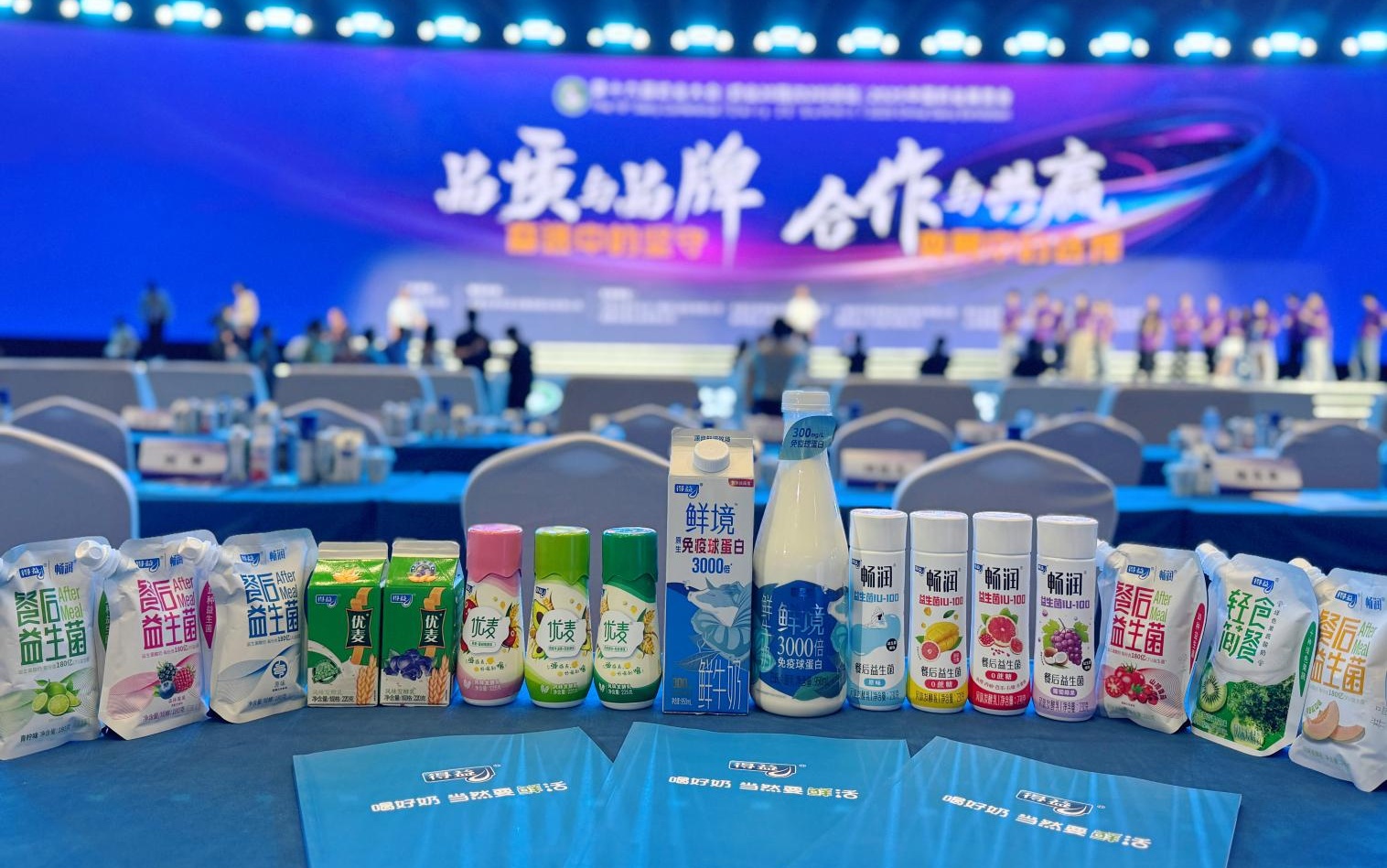 图为:得益乳业鲜境鲜牛奶、畅润酸牛奶等多款明星产品惊艳亮相大会现场