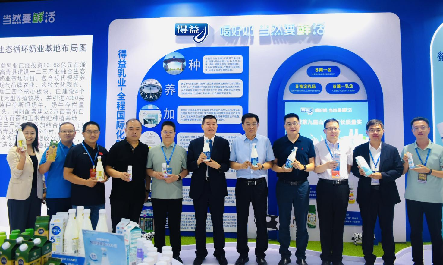 图为:山东省畜牧局党组成员、副局长李新(右五)一行莅临得益乳业展位