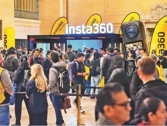 美国当地时间4月22日,海外科技爱好者在纽约中央车站外排起长队,抢购一款能拍摄360度影像、自拍杆可自动“隐形”的中国相机。据影石海外官方社交媒体发布的信息,引发抢购的是其最新发售的旗舰款全景相机。
