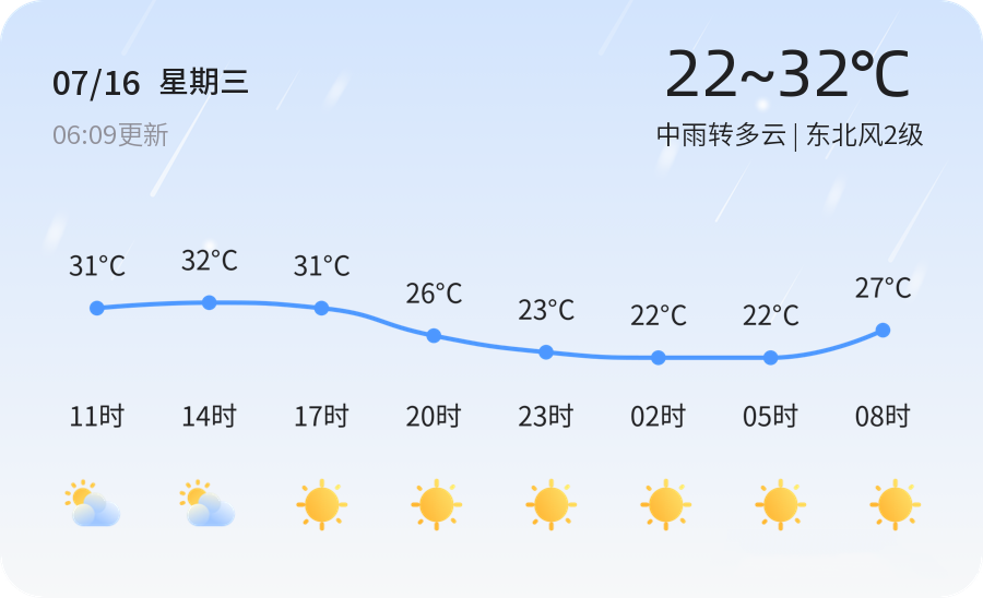 今天是7月16日,星期三,农历六月廿二。滨州今天天气为中雨转多云,气温在22到32摄氏度之间,东北风2级,空气湿度较大,达到92%。AQI指数为27,空气质量优,适合户外活动。预计今天上午降水逐渐减弱,中午前后转为多云天气。建议市民出行携带雨具,注意防范短时强降雨带来的道路湿滑等安全隐患。
