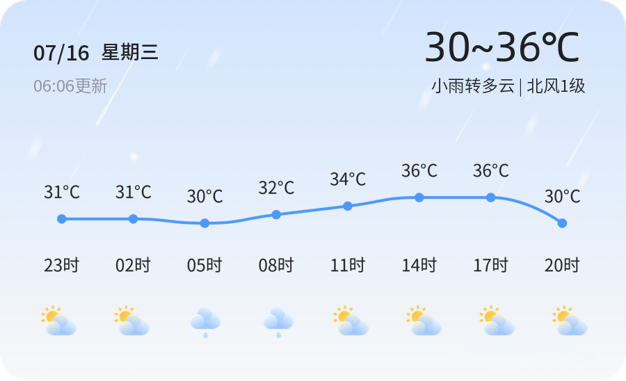 今天是7月16日,星期三,农历六月廿二。济宁市今日天气为小雨转多云,北风1级,当前温度28.9℃,相对湿度79%。空气质量方面,PM2.5指数为41,属于良好水平。预计今天白天最高气温可达36℃,最低气温30℃。由于今日有小雨天气,建议市民出行携带雨具,注意防范道路湿滑,驾车时请减速慢行,确保行车安全。