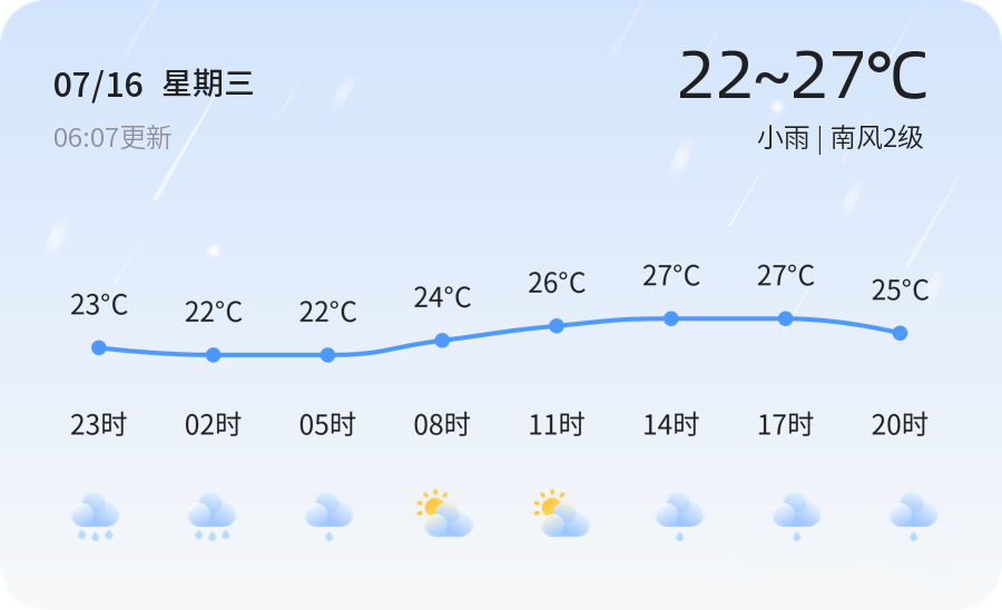 今天是7日,星期三,农历六月廿二。威海市今日天气为小雨,气温介于22℃至27℃之间,南风2级,湿度高达93%,空气质量良好(PM2.5值为33)。今天的天气情况对市民出行有一定的影响,建议市民随身携带雨具,出行时注意防滑,尤其是雨天路滑,驾车时应减速慢行,保持安全距离。此外,由于湿度较大,市民在户外活动时应适当调整衣物,注意防潮保暖。