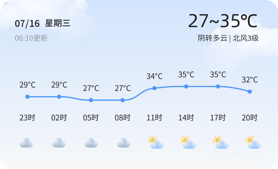 今天是2025年7月16日,星期三,农历六月廿二。聊城天气阴转多云,气温在27℃至35℃之间,北风3级,空气湿度为86%,空气质量良好(PM2.5指数为38)。市民外出时建议携带雨具,注意防晒,以应对多变的天气状况。