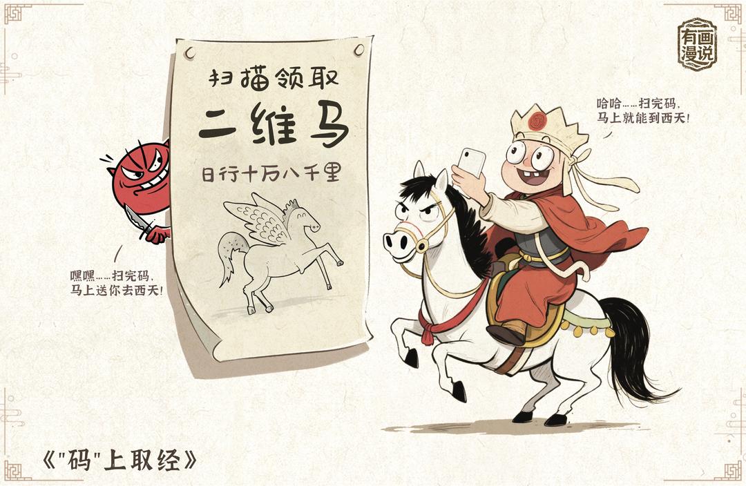 唐僧路过一张告示,上面赫然写着:“扫码领取新坐骑,日行十万八千里!” 他心中一喜,暗想:“若能得此神驹,取经岂不事半功倍?”于是迫不及待地掏出手机,对准二维码一扫——殊不知,暗处正藏着妖精,手持利刃,目露凶光,只等他踏入陷阱……